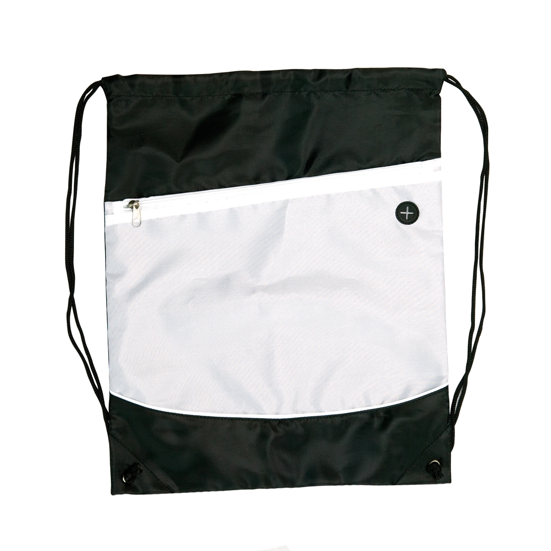 Sac à dos en polyester doux 210T, design bicolore original. Avec poche frontale zippée et passe-fil pour écouteurs. Cordelettes noires de fermeture et coins renforcés par oeillets.